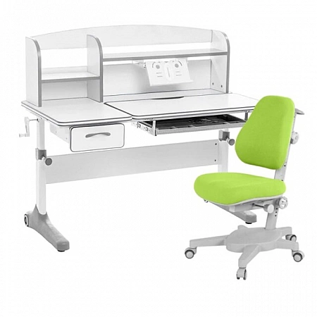No solo un transformador de escritorio, sino una oficina compacta para un niño desde el grado 1 hasta el último año del instituto. El gran tablero (120x60 cm) se divide en 2 zonas. La superficie de trabajo (80x38,5) se puede inclinar entre 0 y 60°, el resto del tablero no cambia de posición. Un complemento con estantes le permite tener a mano y almacenar libros, libros de texto, cuadernos en orden. Para el mismo propósito, sirven un estuche retráctil y un cajón clásico estrecho. Para la comodidad de sentarse en un estante sobre el área de trabajo hay un atril retráctil para libros. Especial atención merece una silla con una forma anatómica del asiento y del respaldo y con un soporte que no interfiere con la comodidad de las piernas. La silla tiene ruedas, pero se bloquean automáticamente al aterrizar, lo que permite proteger la vista y mantener la concentración de la persona sentada. Lo único que realmente no atrae a los compradores de este kit es su precio.Es costoso, pero la practicidad y la capacidad de usarlo durante su capacitación hacen que valga la pena el precio.