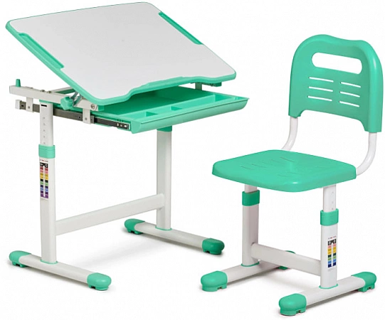 Práctico modelo sobre estructura de metal con una amplia gama de ajustes. El tablero de la mesa se puede elevar de 54 a 76 cm, y la silla de 30 a 44 cm. Esto es suficiente para una persona sentada con una altura de 100 a 170 cm. Sin embargo, la práctica demuestra que el tablero de la mesa será demasiado pequeño para un niño alto El escritorio de la escuela será cómodo hasta los 10-12 años. La inclinación de la superficie de la mesa se puede ajustar de 0 a 40°: puede escribir, dibujar y leer con comodidad y beneficio para su postura. El organizador de estuches retráctiles le permite colocar no solo bolígrafos y lápices, sino también libros de trabajo o álbumes grandes. El juego tiene 4 opciones de color y se adapta fácilmente al interior de la habitación de los niños.A los clientes les gusta la compacidad y la comodidad de la mesa de cultivo, la facilidad de montaje. Sin embargo, muchos se quejan de que los pestillos son bastante débiles y fallan con el tiempo, pero el fabricante los reemplaza de forma gratuita.