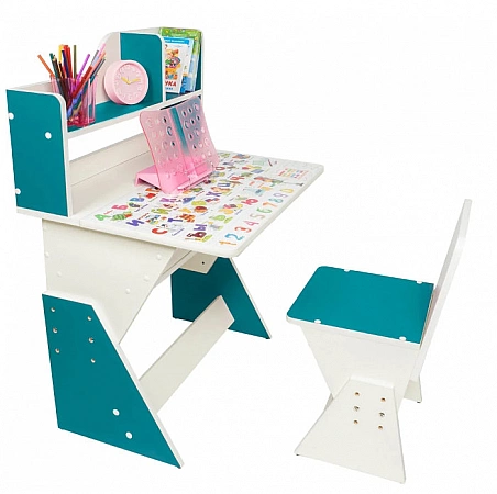 Práctico set con complemento para libros y organizadores con artículos de escritura. Luminoso y cómodo. El escritorio y la silla están diseñados para niños de 100 a 160 cm de altura: la mesa es ajustable entre 46 y 70 cm, la silla mide de 30 a 46 cm, a pesar de las recomendaciones del fabricante, es conveniente usar el kit para niños en edad preescolar solo si está en grados 1-2. Aún así, el tablero de 70x38 cm es demasiado pequeño para los grandes libros de texto y de trabajo modernos. Se aplica un alfabeto brillante en la superficie del escritorio. Aquí no hay cajón, pero la cubierta de la mesa se levanta y debajo hay un lugar para guardar cuadernos y bolígrafos. A los clientes les encanta el diseño, el fácil montaje con tornillos Euro y la práctica extensión de la parte superior de la mesa. Pero el hecho de que el tablero de la mesa no cambie el ángulo de inclinación, desde el punto de vista de los ortopedistas, no es la mejor opción.