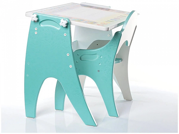 El espacio de trabajo preescolar Tech Kids es uno de los más populares debido a su funcionalidad y precio asequible.El escritorio del conjunto no solo crece y cambia el ángulo de inclinación, sino que también se transforma en un tablero de dibujo. La altura de la mesa se puede ajustar a 46 o 52 cm.El asiento de la silla tiene 3 alturas: 26,30 y 34 cm.Los ajustes están pensados para un niño de 100-130 cm de altura. Una caja de tiza está unida al caballete. Pero no hay caja de lápices o ranura para instrumentos de escritura. Los clientes se quejan de que los bolígrafos y lápices ruedan por el suelo cuando se inclina la mesa. Pero les gusta la facilidad de montaje, el dibujo informativo discreto en la superficie de la mesa y su funcionalidad. El tablero de la mesa tiene líneas y cuadrados para que el niño pueda escribir números y letras con rotuladores de agua.