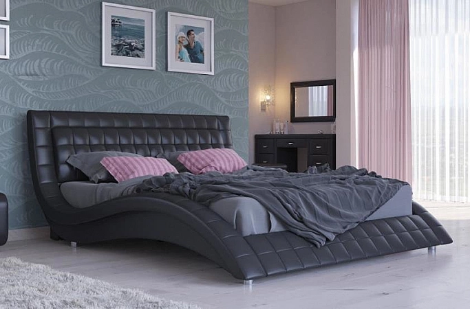 La cama doble más inusual para un dormitorio espacioso, interior de alta tecnología. Con una cama de 160 cm, el ancho es de 192 cm En una habitación pequeña, estos muebles ocuparán la mayor parte del espacio. Pero en términos de conveniencia, supera a todos los participantes en la calificación. El cabecero curvo suave fluye suavemente hacia la base y luego hacia el pie de cama. Las láminas ortopédicas sostienen la columna vertebral durante el sueño. La forma se ve aerodinámica y cómoda. El diseño no se limita a ejemplos en la foto de tiendas en línea. Los compradores tienen cinco opciones de tapicería para elegir: cuero ecológico, flocado, terciopelo, estera y microfibra. Cada material se presenta en diferentes colores, en su mayoría colores pastel. Los compradores describen los pros y los contras en las reseñas. Les gusta el diseño no estándar, la forma cómoda, el mecanismo de elevación con cajones para ropa blanca. Pero no todos los usuarios están satisfechos con la calidad de los materiales.