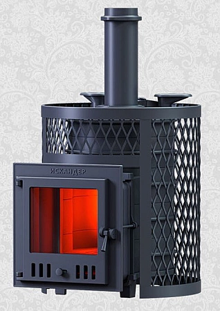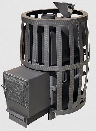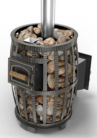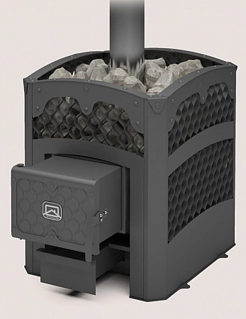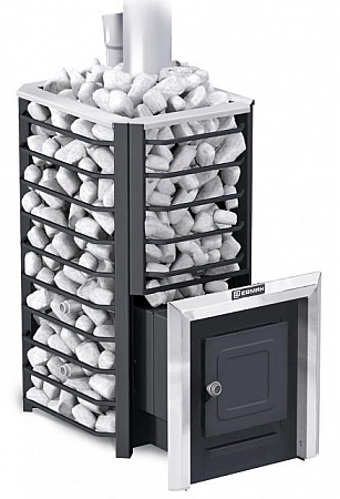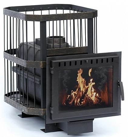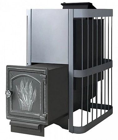 La clásica estufa de leña de hierro fundido con calentador cerrado se distingue por una interesante ejecución de la puerta del horno, que gustó a muchos usuarios. Los diseñadores marcaron correctamente el calentador dentro del horno, lo que garantiza una alta intensidad de calentamiento de las piedras. El fogón espacioso permite usar la leña de cualquier dimensión. El suministro de aire se puede ajustar cómodamente mediante el cajón de cenizas. Con todas sus ventajas, el modelo tiene un inconveniente: las impresionantes dimensiones del horno, lo que hace que sea necesario tomar en serio la elección de la ubicación.