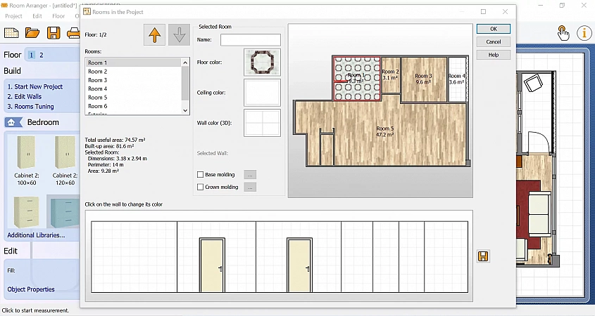Un programa simple con un período de prueba que le permite familiarizarse con todas las funciones y, si lo desea, comprar Room Arranger por solo $ 20 y recibir todas las actualizaciones de forma gratuita en el futuro. La funcionalidad es básica, enfocada más a los principiantes, la biblioteca no es la más extensa en comparación con la competencia, pero se repone, incluso gracias a los usuarios del software.Puede construir su proyecto desde cero, verlo en formato 3D y también es posible combinar pisos en un solo esquema. Una de las adiciones interesantes es la función de cargar su imagen en el editor para una mayor calibración, lo cual es conveniente, por ejemplo, cuando se trabaja con superficies.