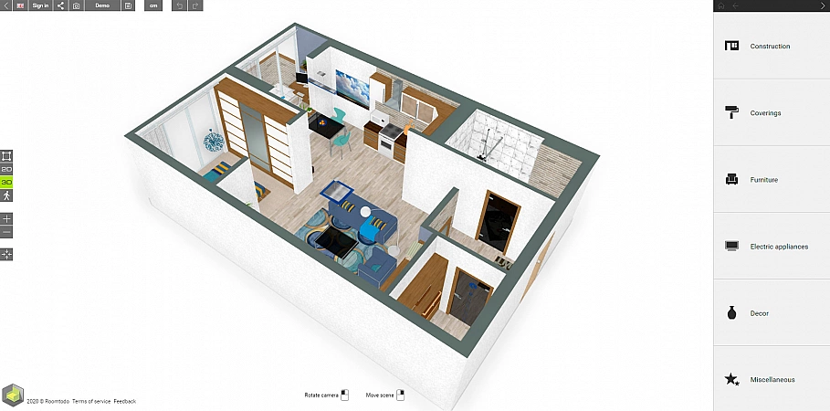 La característica principal de este programa es que funciona exclusivamente en el navegador. Hay un inconveniente en esto: se requiere una buena velocidad de conexión; de lo contrario, puede encontrar ralentizaciones. Con soporte en inglés y ruso, todas las herramientas necesarias para el diseño de interiores están disponibles: una biblioteca extensa y constantemente actualizada, la creación de proyectos simples y formas complejas, la función de dibujar sobre dibujos, enviar un enlace al trabajo terminado. El concepto se puede construir en varios modos e incluso caminar alrededor del objeto. Tenga en cuenta que para trabajar en dispositivos móviles necesitará al menos 3 GB de RAM. Para complementar el conjunto de herramientas y recibir rápidamente consejos del servicio de soporte, puede comprar una suscripción, desde $ 10 por mes hasta $ 30 por año.