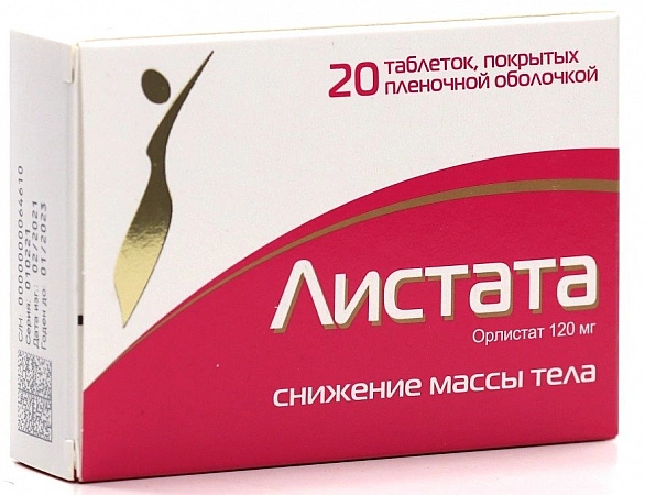 Listata difiere de otras drogas con un efecto leve en el cuerpo y buena tolerancia.Solo ocasionalmente, los pacientes informan la aparición de efectos secundarios en forma de diarrea, distensión abdominal y náuseas. La frecuencia de toma de comprimidos depende del número de comidas principales, pero no más de 3 veces al día. Los pacientes notan el efecto de tomar el medicamento después de aproximadamente 7 a 14 días. El medicamento está disponible en una dosis de 120 mg y el costo de Listat encantará a los compradores por su asequibilidad.