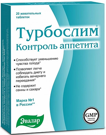 Control del apetito Turboslim | 327 frotar. | L-carnitina, extracto de té verde, picolinato de cromo, extracto de hoodia | Rusia |