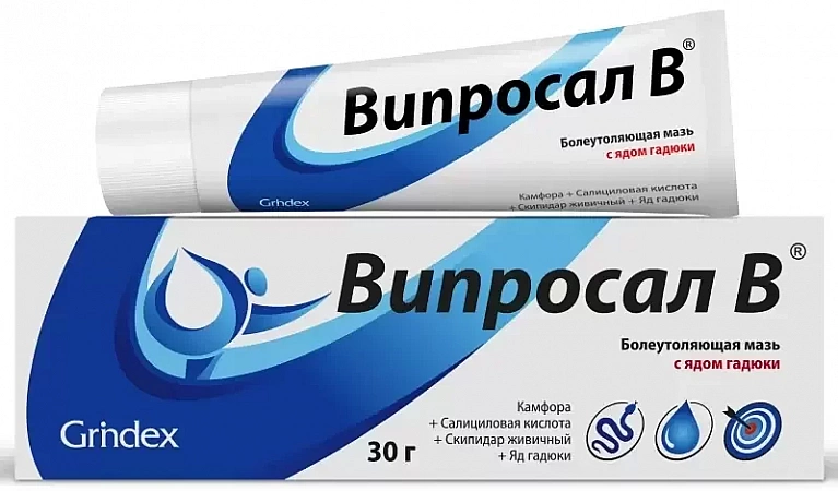 La composición de esta pomada incluye veneno de serpiente, que tiene un efecto analgésico y reflejo local comprobado. El remedio se potencia con otros componentes analgésicos, antiinflamatorios y distractores de origen natural. Viprosal B es un ungüento conocido y probado que, de acuerdo con las instrucciones de uso, ayuda con el dolor muscular, el dolor de espalda, el dolor en las articulaciones y otros problemas.Sin embargo, los médicos recomiendan no dejarse llevar por este remedio, ya que puede causar ardor y dermatitis en el sitio de aplicación, y no ayudará con problemas graves.