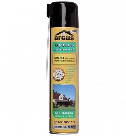 El fabricante ARGUS MAX se enorgullece de llamar a su producto Diclorvos No. 1. Un spray instantáneo es adecuado para envenenar chinches, cucarachas, mosquitos, polillas y otras plagas domésticas. Mata insectos gracias a su eficaz composición con una sustancia sinérgica que potencia la acción de otros insecticidas. Los compradores responden bien a la calidad y eficacia del aerosol. El tubo rociador es muy conveniente y el olor a productos químicos desaparece rápidamente del apartamento. El producto no logró ocupar una posición más alta en el ranking debido a la pequeña cantidad de reseñas y al precio más alto. Los aerosoles económicos generalmente cuestan un poco menos, pero es importante tener en cuenta la impresionante cantidad de fondos.