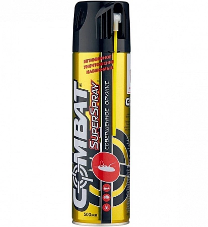 Combat SuperSpray está diseñado para envenenar no solo a las chinches, sino también a las pulgas, garrapatas, hormigas, cucarachas y otros insectos rastreros. La herramienta se puede utilizar en casa y en la calle, el rociador tiene una boquilla flexible para máxima comodidad. Según el fabricante, el efecto debería durar al menos un mes después del tratamiento del apartamento. Los insectos desaparecen después de algunas semanas, pero pueden regresar. El principal inconveniente del aerosol no es la mejor composición: en las revisiones se quejan de tos y asfixia, incluso con una máscara protectora. Las personas con alergias o hipersensibilidad deben elegir otra opción.