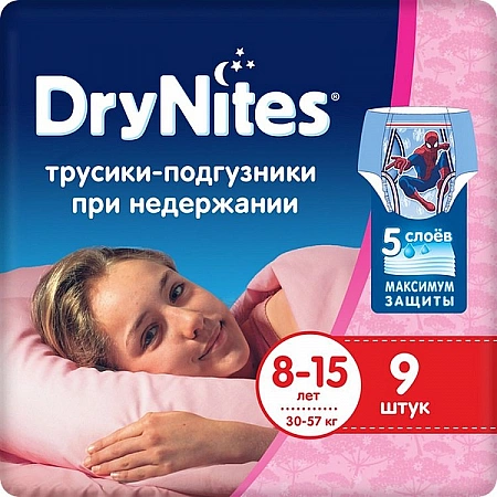 A DryNites by Huggies egy pelenkabugyi idősebb babáknak ágybavizezéssel. A sorozat fiúk és lányok számára készült modelleket tartalmaz, 4-7 és 8-15 éves korig. A modelleket fokozott puhaság jellemzi, meglehetősen vékonyak, és vizuálisan hasonlítanak a fehérneműre. Ennek célja nem annyira a fizikai, mint inkább a pszichés kényelmetlenség csökkentése, amelyet gyakran tapasztalnak az inkontinenciában szenvedő idősebb gyermekek. A vélemények megerősítik, hogy a bugyi nem szivárog az éjszaka folyamán, nem okoz visszautasítást a gyermekben, és nem susog. A 10 darab ára nem a legolcsóbb, és talán ez a DryNites egyetlen komoly hátránya.