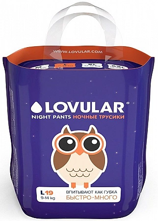 A Lovular Night pelenkát-bugyit fokozott nedvszívó képesség jellemzi, ami garantált függetlenül attól, hogy a gyermek milyen pozícióban szokott aludni. A legkisebb nedvszívó szemcsék egyenletes eloszlása biztosítja a nedvesség lehető leggyorsabb eltávolítását. A teljes kijelző jelzi, hogy mikor kell pelenkát cserélni. A rugalmas derékpánt biztonságosan, de finoman rögzíti a bugyit a testhez.A gyártó három méretet kínál különböző korú gyerekek számára. A bugyi könnyen felvehető és könnyen levehető az oldalán lévő rugalmas szalagok letépésével. A szülők többnyire pozitív véleményeket hagynak ezekről a bugyiról, csak a költségüket említik hátrányként, valamint a ragadós réteg hiányát a kényelmes elhelyezés érdekében.