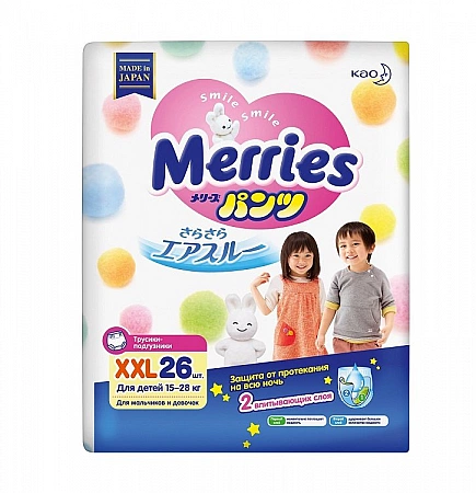 A japán Merries márka egy lehetőséget kínál az XXL méretű éjszakai pelenkákhoz, amelyek legfeljebb 28 kg súlyú gyermekek számára alkalmasak. Két nedvszívó réteg gyorsan felszívja a nedvességet és biztonságosan bent tartja. Még akkor is, ha a baba éjszaka aktívan hánykolódik, a szivárgás teljesen kizárt. A bugyi jól illeszkedik, de nincs alatta üvegházhatás, mivel a hő és az izzadság távozik az innovatív, lélegző anyagok használatával. A Merries japán pelenkák nem olcsók, de sok szülő csak bennük bízik, megerősítve az illatanyagokat nem tartalmazó, hipoallergén és nem okozó termékek magas minőségét és biztonságát.