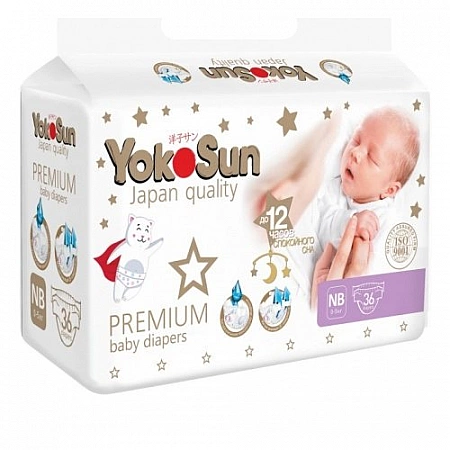 A YokoSun márka Premium sorozatából származó japán pelenkák nem közvetlenül éjszakai pelenkákként vannak elhelyezve, és a nap bármely szakában használhatók. A csomagoláson azonban a gyártó azt írja, hogy ez a modell 12 órán keresztül képes szárazon tartani és megtartani a nedvességet, ami azt jelzi, hogy a legjobb éjszakai használatra. A modellt széles méretválaszték képviseli, amelyben mind az újszülöttek, köztük a koraszülöttek, mind a már felnőtt babák számára van lehetőség. Az innovatív nedvszívó gyorsan felszívja a nedvességet, nem gyűrődik, a légáteresztő felület pedig megszünteti az üvegházhatást. A YokoSun prémium modellje meglehetősen népszerű.