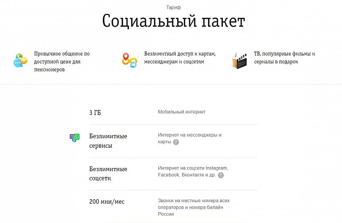 A Beeline "szociális csomagja" egy megfizethető tarifa, amelyet kifejezetten a nyugdíjasok számára hoztak létre. Bárki kötheti, aki életkora, rokkantsága vagy egyéb ok miatt nyugdíjat kap. Az előfizető minden hónapban 200 percnyi kommunikációt biztosít a hazai régión belül. Ezeket azonban a Beeline és más szolgáltatók hívásakor költik el, nincs szétválasztás. A fő limit kimerülése után a hálózaton belüli hívások (a távolsági hívások is) ingyenesek maradnak. Nincs sok internet - csak 3 GB egy hónapra. De emellett korlátlan hozzáférés áll rendelkezésre a közösségi hálózatokhoz, az azonnali üzenetküldőkhöz és a kártyákhoz.Igaz, sokan panaszkodnak az alacsony letöltési sebességre. Egy másik meglehetősen nagy mínusz, hogy a régi számmal lehetetlen áttérni, újat kell kiadnia.
