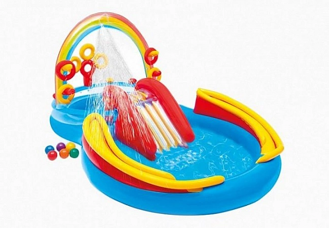 Ez a Rainbow Ring Play Center gyermekjáték-komplexum egy igazi miniatűr vízi park. Azon kevesek egyike, amely két csúszdával összekapcsolt medencét egyesít. A csúszdán kívül a készlet tartalmaz egy ívet, felfújható gyűrűket és műanyag labdákat a célba dobáshoz, egy szőnyeget a csúszdáról való lágy landoláshoz, valamint egy, az ív tetején elhelyezett sprinklert, egy leeresztő szelepet és egy javítókészlet. A medence oldalai puhák, így nem kell aggódnia a gyerekek biztonsága miatt.Ennek a modellnek a gyártásához tartós vinilt használtak, a maximális terhelés, amelyre a kialakítást tervezték, 81 kg, a játékkomplexumban egyszerre 3-4 gyermek fér el. Az egyetlen hátránya, hogy a kényelmes utazáshoz a csúszdát kézzel kell öntözni.