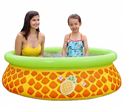A világos ananászmintás felfújható medence 3 éves és idősebb gyermekek számára készült. Kis méretéből adódóan nem csak nyaralóba telepíthető, hanem minden, amit magaddal viszel a természetbe, főleg ha a közelben van vízforrás. Szüksége lesz azonban egy vízszintes felületre, mivel a medence feneke kemény. Egy ilyen medencét 10-15 perc alatt összeállíthat.Háromrétegű PVC fóliából készül. Csak a felső széle van felfújva, amelyen a teljes szerkezet nyugszik. A medence vízzel való feltöltéséhez a tömlőt a külső felületen található műanyag csonkhoz kell csatlakoztatni. Sérülés esetén a készlet tartalmaz egy öntapadó tapaszt.