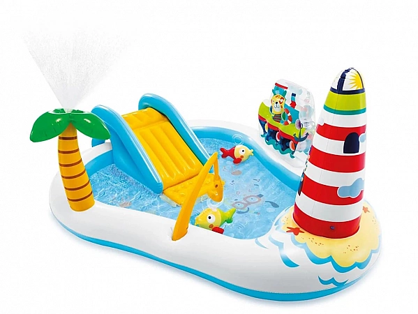 A készlet tartalmazza magát a medencét, felfújható csúszdát, hajókat, világítótornyot, horgászbotot és halakat.