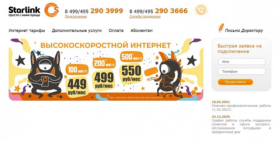 ספקית אינטרנט ביתית פופולרית נוספת, Starlink, פועלת עבור תושבי הבירה מאז 1996. החברה משפרת באופן קבוע את איכות השירותים ומציגה טכנולוגיות חדשניות. אזור הכיסוי כולל כמעט את כל מחוז מוסקבה, כך שהחיבור מהיר מאוד - אתה יכול להתקשר למאסטרים ביום הבקשה או למחרת. Starlink משמח עם מחירים נמוכים ומהירות חיבור גבוהה.עם זאת, כמו במקומות אחרים, ישנם כשלים ותקלות. על פי ביקורות, האינטרנט לא עובד לעתים קרובות למדי, ולמרות ההתאוששות המהירה, זה עדיין מעצבן. יחד עם זאת, שירות התמיכה לא תמיד מגיב בצורה נכונה לתלונות של לקוחות.