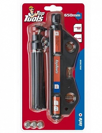 מפלס לייזר אלומיניום Top Tools 29C902 קטן בגודלו (240 x 125 x 27 מ"מ), נוח להשתמש בו במקומות שקשה להגיע אליהם. ההבדל העיקרי הוא הראש המסתובב בחצובה, אשר קבוע בכל עמדה.