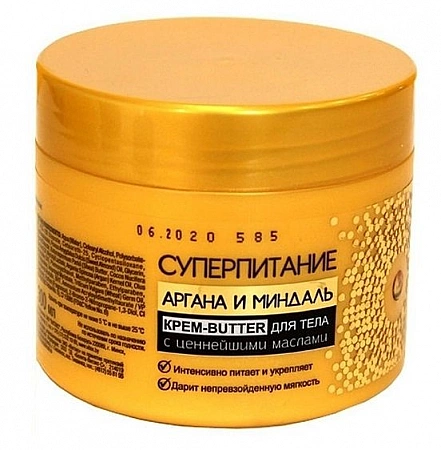"SUPER NUTRITION ארגן ושקדים" היא קרם-חמאה של המותג הבלארוסי "Viteks". המוצר מיועד להזנה אינטנסיבית ושיקום העור, במטרה להגביר את חלקו, להפעיל תהליכי התחדשות.כמות גדולה של שמנים יקרי ערך בהרכב מאפשרת לו להיספג במהירות ולהיספג בצורה מושלמת. העקביות של המוצר סמיכה למדי ואפילו נראית שמנונית בהתחלה, אבל מספיקות רק כמה שניות כדי שהוא יתמוסס לחלוטין על העור. קרם-חמאה בלארוסית זו מתמקדת יותר בטיפוח עור יבש ותהפוך לכלי הכרחי בעונה הקרה.