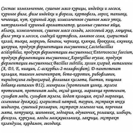 אחת ההוליסטיות הזולות ביותר ללא דגנים. המחיר מתחיל מ 496 רובל לקילוגרם. יחד עם זאת, אם תרצו, תוכלו להצטייד באוכל לאורך זמן בבחירת חבילה של 12 ק"ג.