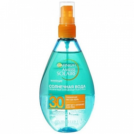 GARNIER Solar Water הוא ספריי השמש האולטימטיבי עם מרקם קליל ומרענן. טיפול פנים וגוף דו-פאזי עם אלוורה וויטמין E מגן מפני קרינת UVA/UVB, הופך את העור לרך יותר, מעניק לו לחות. מונע היווצרות כתמי גיל ושינויים הקשורים לגיל כתוצאה מחשיפה לשמש. התרסיס בעל מרקם קליל ולכן אינו גורם לעור להיות שומני, אינו נדבק, אינו משאיר סימנים לבנים ותחושת סרט לא נעימה. בביקורות ניתן לקרוא שהמוצר עושה את תפקידו העיקרי היטב, נעים למריחה, קל לשימוש, קל לריסוס, בעל ריח ניטרלי. אבל הוא משאיר כתמים על הבגדים, לכן חשוב להמתין זמן מה לאחר המריחה.