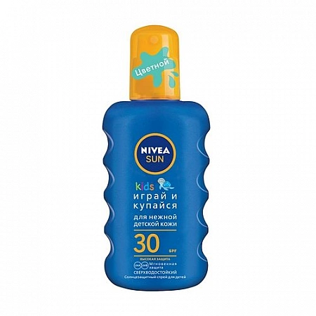 Nivea Baby Spray "Play and Swim" מיועד לילדים מגיל 3 שנים. יש לו צבע ירוק מנטה שנעלם כמה שניות לאחר היישום.התרסיס מגן ביעילות מפני קרינת UVA/UVB, מפחית את הסיכון להתפתחות ביטויים אלרגיים מחשיפה לשמש, מונע צריבה ואדמומיות בעור העדין של התינוק. הוא עמיד במיוחד במים, כך שהוא יגן על העור מפני השמש גם לאחר שהייה במים. הודות לפנטנול, המוצר מרכך את עור התינוק. המשתמשים מציינים כי לתרסיס ריח נעים, נמרח ומפוזר היטב, אינו גורם לגירוי, מעניק לחות היטב ואינו מבוזבז במהירות. אבל זה יוצר סרט דביק קטן על העור, שרבים לא אוהבים.
