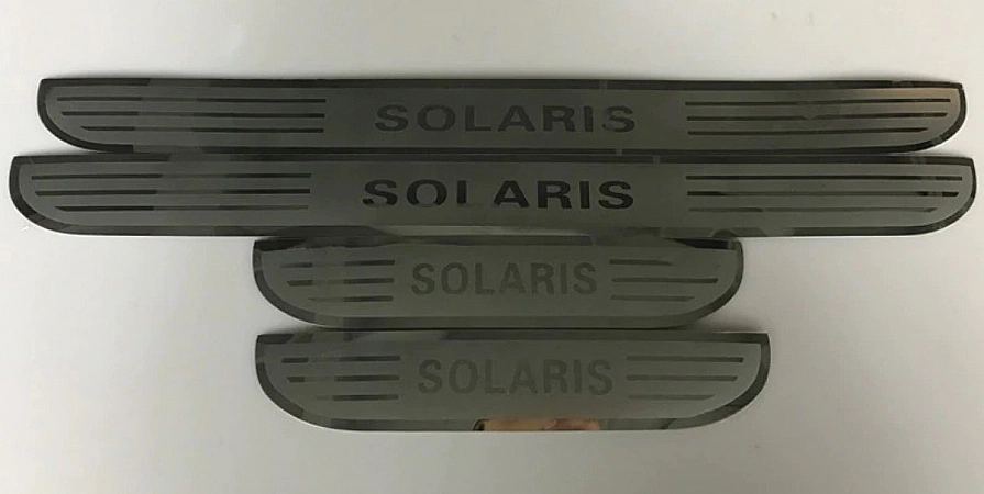 Pelekat untuk ambang kereta kerap menjadi penjual teratas di Aliexpress. Daripada pengeluar yang berbeza, anda boleh menemui aksesori dengan reka bentuk yang luar biasa, sisipan reflektif dan logo jenama. Produk ini dibezakan oleh mutu kerja yang sempurna dan inskripsi tandatangan Solaris, dibuat dalam cat "cermin". Daripada PVC biasa, keluli tahan karat digunakan, supaya produk itu akan bertahan lama. Logam itu nipis, tetapi membongkoknya akan menjadi masalah. Pelekat kelihatan baik dan sesuai untuk Hyundai tahun pembuatan yang berbeza. Antara kekurangannya, hanya kotak yang renyuk disebut.