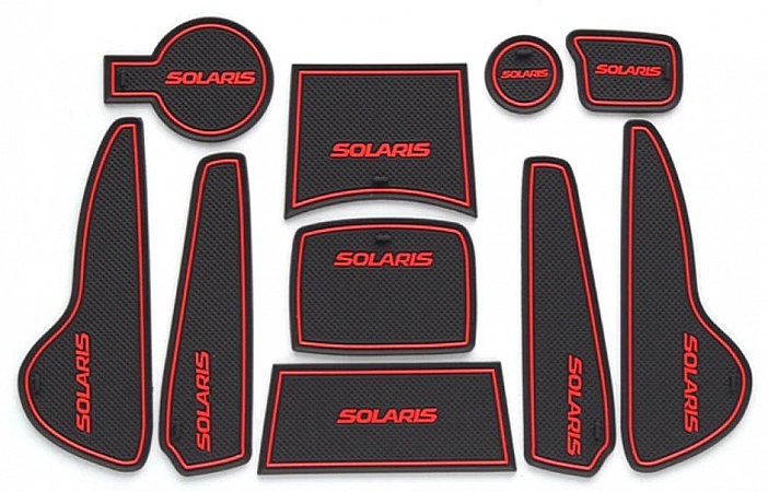 Jika dua pemegang cawan berharga kurang daripada 100 rubel, maka dengan membayar sejumlah kecil, anda boleh mendapatkan set lengkap tikar tidak licin untuk Hyundai Solaris. Mereka datang dalam 3 warna (dengan nama jenama putih, biru atau merah). Set ini termasuk permaidani mini getah 10/14 dengan corak timbul, nombor bergantung pada versi yang dipilih. Inskripsi putih dibuat dengan cat fosfor yang bersinar dalam gelap. Berdasarkan ulasan, kualitinya sangat baik, tiada bau dan tiada kesan gam. Terdapat hanya satu tolak - anda perlu berhati-hati memilih model kereta, jika tidak tikar mungkin tidak sesuai.