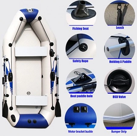 Terdapat banyak produk di Aliexpress yang hanya boleh dipanggil bot dengan regangan besar, tetapi bukan produk ini. Ini betul-betul bot, dan dengan transom sendiri dan dua tebing pendaratan yang diperbuat daripada plastik. Ia mempunyai bahagian bawah kembung dalam bentuk ruang udara yang berasingan dan injap berganda dengan perlindungan terhadap keturunan. Terdapat tali pengangkut dan pengayuh untuk sepasang dayung. Kami sedang mempertimbangkan bot dua tempat duduk dengan kapasiti muatan 350 kilogram.Tetapi daripada penjual ini anda juga boleh memilih versi yang lebih besar untuk sehingga 8 orang dengan tiga oarlocks dan ketahanan yang sesuai. Memancing di atas bot sedemikian akan menjadi semudah dan selesa yang mungkin. Bagasi dan rod juga mempunyai ruang di haluan atau di bawah transom.