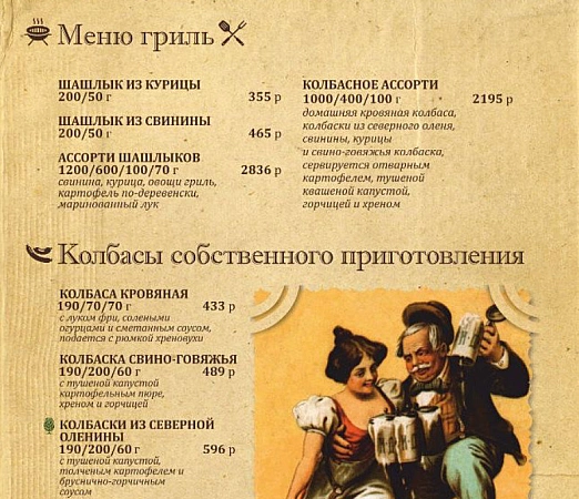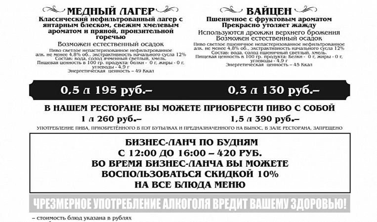 Restoran murah dengan kilang birnya sendiri dan bir yang sentiasa segar. Terletak di pusat bandar, di pusat membeli-belah Pobeda, tingkap-tingkap menawarkan pemandangan dataran yang indah.Menu ini termasuk minuman bir beralkohol yang menarik, alkohol yang kuat, serta koktel bukan alkohol. Makanan di sini dianggap sebagai salah satu yang terbaik di Kaliningrad. Masakan Eropah, ada masakan Rusia, makanan laut. Makanan ringan untuk bir dianggap sangat lazat di institusi. Tetapi makan tengah hari di restoran agak lengkap: 1 bahagian besar makanan cukup untuk 2 tetamu. Tiada muzik langsung di institusi itu, tetapi muzik latar belakang tidak mengganggu bersantai dengan syarikat besar. Tiada menu kanak-kanak di kafe, tetapi beberapa hidangan yang tersedia mungkin sesuai dengan citarasa gourmet muda. Keburukan restoran adalah kecil, tetapi ia masih ada. Kadang-kadang pelawat mengadu tentang kelambatan kakitangan, ditutup pada pukul 23:00 (orang ramai diminta keluar 5-10 minit lebih awal).