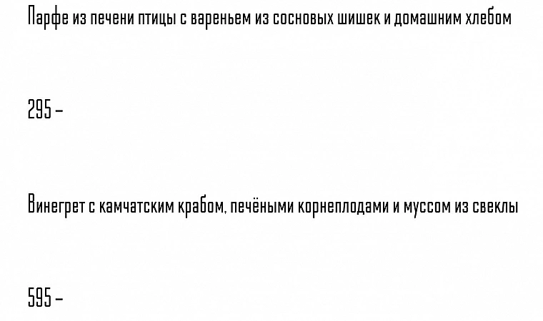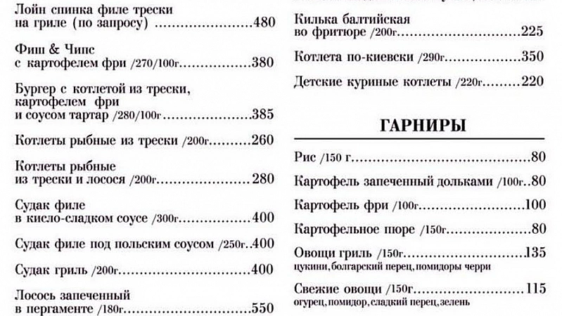 Restoran ini menyajikan hasil tempatan. Semua ikan ditangkap di sekitar wilayah Kaliningrad.