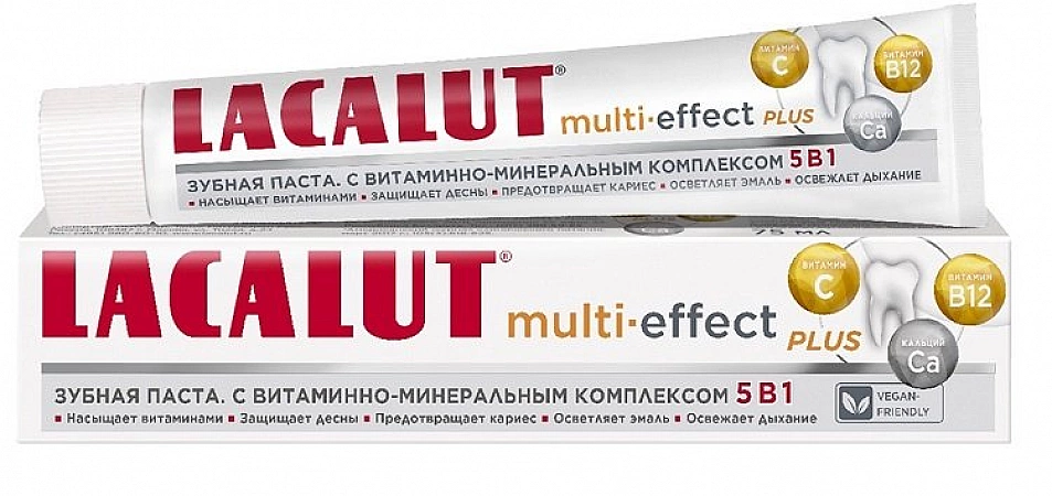 Lacalut Multi-Effect plus ialah ubat gigi terapeutik dan profilaksis yang menyembuhkan secara menyeluruh rongga mulut, menjaga keadaan gigi dan gusi.