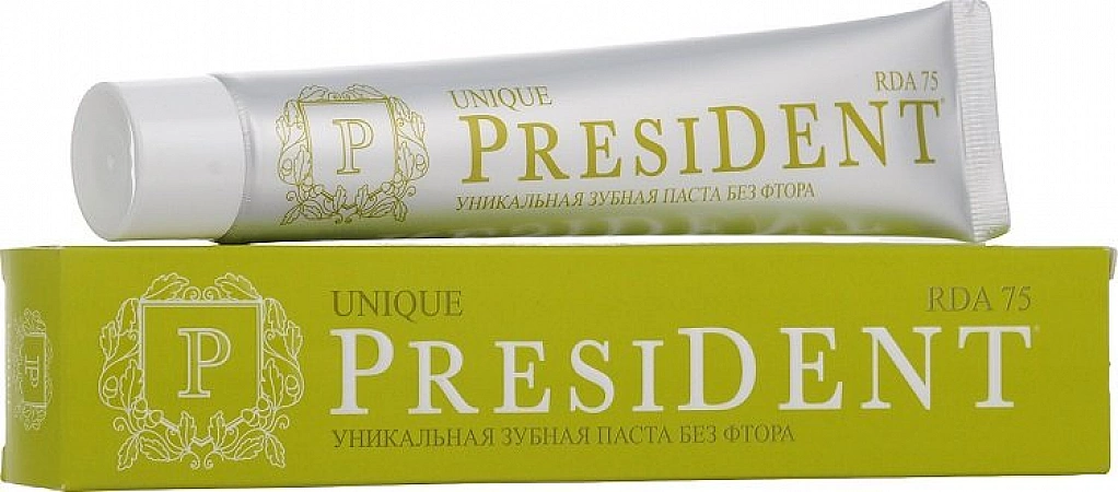 President Unique ialah ubat gigi bebas fluorida yang mengandungi zarah kasar yang selamat untuk penyingkiran plak dan penggilapan enamel yang unggul. Komposisi ini mengandungi biokalsium yang tersedia untuk asimilasi, yang membantu dalam pemineralan semula enamel, papain untuk pembersihan plak, aloe vera untuk penjagaan gusi. Pes ini bertujuan terutamanya untuk penduduk di kawasan tersebut di mana kandungan fluorin dalam air meningkat. Terdapat sedikit ulasan tentang alat ini, yang disebabkan terutamanya oleh fakta bahawa kosnya lebih tinggi daripada purata. Ramai yang telah mencuba Presiden Unique menyebutnya biasa-biasa, tidak menemui apa-apa yang luar biasa. Yang lain memilihnya kerana kepercayaan mereka terhadap pengilang dan kualiti Itali.