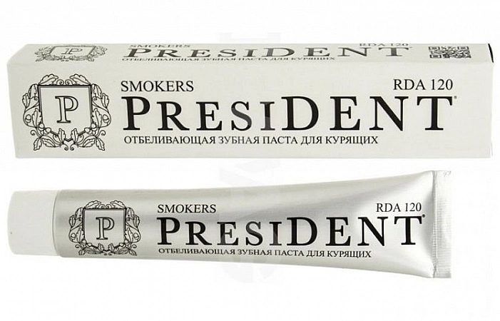 President Smokers direka khusus untuk menghilangkan plak nikotin pada gigi dan bau tembakau. Komposisi ini mengandungi fluorida, yang menguatkan enamel, serbuk arang buluh, yang bertindak sebagai pelelas, serta ekstrak pudina, pasli dan limau, yang membantu menyegarkan nafas, melindungi gusi dan meningkatkan mikroflora. Indeks RDA - indeks keabsahan produk ini ialah 120 unit, yang sedikit lebih daripada yang diperlukan untuk penggunaan yang selamat sepenuhnya. Ini bermakna pes itu membersihkan plak dengan baik, tetapi pada sesetengah orang ia boleh menyumbang kepada penipisan enamel dan meningkatkan sensitiviti gigi. Kebanyakan ulasan Presiden Smokers kedengaran positif. Walaupun RDA tinggi, sebilangan orang yang telah mencubanya tidak berpuas hati dengan kesan pemutihan pes tersebut.