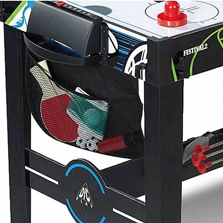 Satu-satunya meja permainan pelbagai fungsi yang termasuk hoki. Ini adalah peluang unik untuk mencuba pelbagai jenis permainan tanpa menjadikan tapak semaian sebagai gudang. Walaupun fungsinya yang hebat, meja mengambil ruang yang agak sedikit. Ia tidak memerlukan sambungan elektrik, yang membolehkan anda meletakkannya di mana-mana sudut apartmen. Kit pembangunan DFC sangat kaya dan merangkumi semua yang anda perlukan untuk semua 12 permainan, termasuk raket pingpong, 2 bola bola sepak dan keping hoki. Pada masa yang sama, model ini menawarkan storan padat dan kemudahan peralihan dari satu permainan ke permainan yang lain. Ia cukup untuk meletakkan medan yang dikehendaki dari set di atas meja. Tetapi perhimpunan pertama akan memerlukan banyak masa dan usaha, kerana terdapat banyak butiran. Di samping itu, ia adalah keseronokan yang sangat mahal.