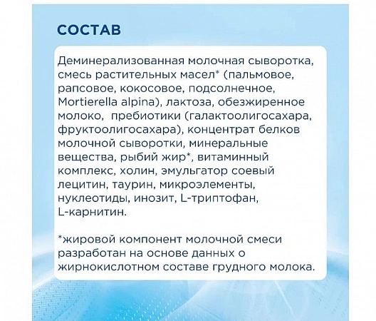 Formula yang cukup popular yang boleh digunakan sejak hari lahir pertama jika ibu tidak mempunyai susu ibu yang mencukupi. Ia adalah optimum dalam kebanyakan parameter - kos yang berpatutan, kekurangan minyak sawit dan bahan lain yang tidak diingini, pelbagai bahan tambahan yang berguna. Sebagai tambahan kepada probiotik, bifidobakteria, campuran mengandungi oligosakarida susu ibu, yang menyumbang kepada pembentukan imuniti yang sihat. Bagi kebanyakan kanak-kanak, susu sangat sesuai, tidak menyebabkan alahan, kolik, dan gangguan pencernaan. Walau bagaimanapun, tindak balas individu tidak boleh diketepikan. Apa yang sesetengah ibu bapa tidak suka ialah sedikit bau dan rasa minyak ikan. Tetapi kanak-kanak minum campuran dengan baik, dengan selera makan.