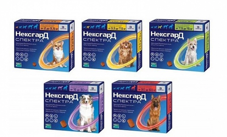 Nexgard Spectra ialah ubat yang unik dalam sifatnya dan memberikan perlindungan berkualiti tinggi terhadap kedua-dua parasit luaran dan dalaman. Ia boleh digunakan untuk merawat dan mencegah kerosakan pada anjing oleh kutu, kutu, serta demodicosis dan otodecosis. Ubat ini juga berkesan terhadap beberapa helminths. Satu dos sudah cukup untuk memberikan perlindungan menyeluruh dan lengkap sehingga sebulan. Dijual adalah pilihan dos untuk haiwan dari 2 hingga 60 kg. Alat ini mahal, walaupun mempertimbangkan tiga tablet dalam satu pakej, tetapi kosnya dibenarkan oleh komposisi yang kompleks dan keselesaan penggunaan. Haiwan tanpa paksaan makan tablet dengan rasa daging lembu yang menyenangkan untuk mereka. Ubat ini agak selamat, tetapi risiko kesan sampingan selepas mengambilnya masih wujud.