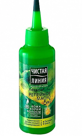 Minyak burdock telah lama terkenal dengan ciri uniknya dalam penjagaan rambut. Jenama Chistaya Liniya telah membangunkan produk di mana bahan ini ditambah dengan komponen berguna lain, menghasilkan Minyak Rambut 5 dalam 1. Produk ini mempunyai tindakan kompleks yang bertujuan untuk memulihkan helai yang rosak, mengurangkan keguguran rambut, mengaktifkan pertumbuhan, pemakanan intensif dan memberikan kilauan semula jadi. Produk ini agak murah, walaupun jumlahnya kecil. Alat ini menerima ulasan yang baik, termasuk kerana kosnya. Komposisi produk tidak sempurna, kerana sebagai tambahan kepada bahan semulajadi, ia mengandungi pengawet dan paraben.