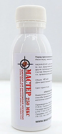 Master-250 µs bertujuan untuk kegunaan rumah dan merupakan salah satu cara terbaik untuk membunuh pepijat katil dan lipas yang ada di mana-mana dan telah digunakan di Israel dan Rusia selama lebih 20 tahun. Ia mengandungi kepekatan tinggi chlorpyrifos, yang lebih berkesan daripada pyrethroids, yang mana banyak perosak di bangunan pangsapuri telah membangunkan imuniti. Pada masa yang sama, produk itu mempunyai bau yang bertolak ansur, yang hilang dengan cepat, dan tidak sukar untuk menggunakannya. Keberkesanan racun itu disahkan oleh berpuluh-puluh ulasan. Kelebihan "Masters-250 μs" yang tidak diragukan ialah tindakan universalnya terhadap semua serangga yang merangkak.