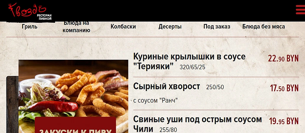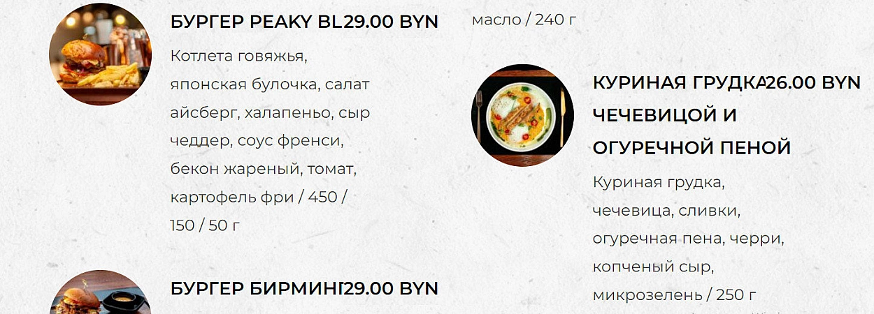 Restaurante relativamente jovem, mas já conseguiu fazer muito barulho por causa do nome. Os donos do Minsk Peaky Blinders conseguiram transmitir muito bem a atmosfera da série de gângsteres. A culinária daqui, segundo os comentários, é uma das melhores da cidade: os cozinheiros cozinham sem frescuras, mas bem gostosos. Um café com um nome brilhante está localizado longe do centro, mas isso não o torna menos movimentado. Os pratos da instituição não são os mais baratos, mas seu custo é totalmente justificado pela qualidade. Aliás, no cardápio do restaurante você encontra quase qualquer prato: de pãezinhos e sopa Tom Yam a hambúrgueres, bifes e até borscht. Os pratos são saborosos, mas nem todos os convidados gostam deles. Além disso, alguns visitantes às vezes sentem falta de atenção da equipe.