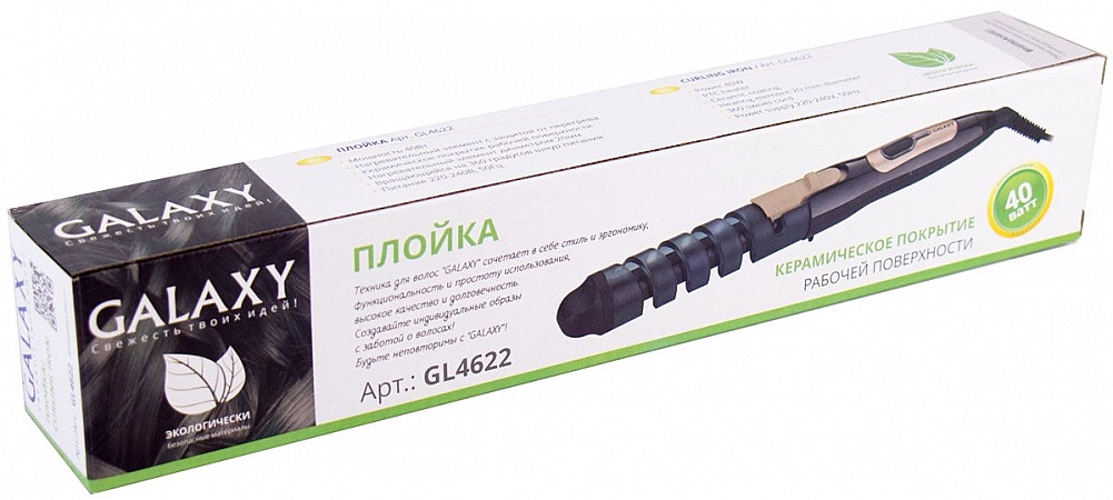 Para aqueles que preferem estilo e volume cuidadosos, recomendamos escolher o modelador de cachos Galaxy GL4622 mais econômico. É perfeito para curling confortável de qualquer tipo de banda. A segurança absoluta é garantida pelo revestimento cerâmico das placas. O dispositivo cabe confortavelmente na mão e é fácil de usar. Em apenas 20-25 minutos com ele, você pode criar um estilo elegante. As placas não ressecam o cabelo e não danificam sua estrutura, deixando-o limpo e atraente. Prós - cabo giratório, função de desligamento automático, ergonomia. Contras - não há controlador de temperatura, com uso prolongado há cheiro de plástico.