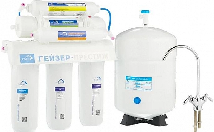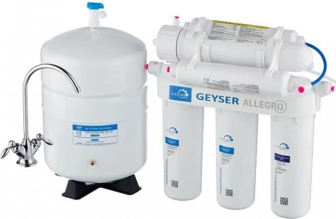 Se você escolher um sistema de osmose reversa barato, você pode considerar o modelo Geyser Allegro M. Este é um filtro de seis estágios com um grande tanque de armazenamento que faz um excelente trabalho de purificação da água. Uma característica interessante é uma torneira dupla, que, a pedido do usuário, fornece água purificada de todas as impurezas e sais de dureza ou mineralizada. Apesar do preço acessível, o modelo atende totalmente ao seu propósito, não é pior do que os sistemas de osmose reversa mais caros. Mas os compradores têm reclamações sobre a qualidade. Eles dizem respeito à falta de algumas vedações no kit, vazamentos e outras falhas de projeto. Isso pode complicar a instalação, embora geralmente não haja problemas com isso.