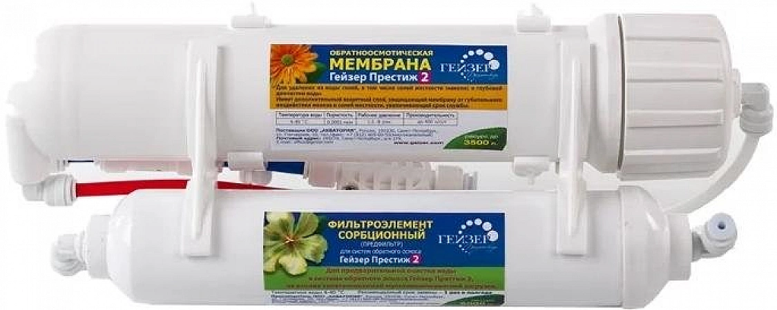 Um sistema de dois estágios sem tanque de osmose reversa do fabricante Geyser será a melhor solução se for impossível instalar um dispositivo geral sob a pia. É compacto, mas eficaz - limpa perfeitamente a água, tornando-a macia e agradável de beber crua. Agrada e custo acessível - de 5.000 a 6.000 rublos. A ausência de um tanque parece uma desvantagem para alguns usuários, mas, se necessário, pode ser instalado separadamente. Se a água não for muito dura, o cartucho incluído no kit dura muito tempo, seu recurso médio é de cerca de 6.000 litros. A taxa de filtração depende da pressão no sistema, mas em qualquer caso não é muito alta. Mas esta é uma das poucas desvantagens, especialmente devido ao baixo preço.