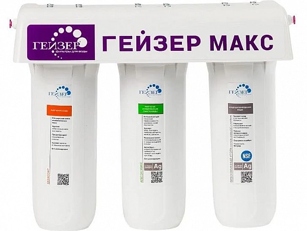 O filtro Geyser Max foi projetado para água dura. Elimina o problema de incrustação sem remover minerais benéficos como sistemas de osmose reversa. Esta é uma opção de fluxo contínuo, que não é equipada com tanque, ocupa um espaço mínimo sob a pia. A ausência de capacidade de armazenamento neste caso pode ser chamada de desvantagem com um grande trecho - o desempenho do dispositivo é de até 3 litros por minuto, o volume necessário de água é coletado rapidamente. Os filtros servem por um longo tempo - de seis meses a um ano. Se a água estiver muito dura, pode ser necessário trocá-la com um pouco mais de frequência. Na saída, o sabor da água é agradável, suave. Depois de instalar um novo cartucho, pode haver um leve amargor, mas desaparece rapidamente.