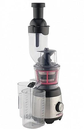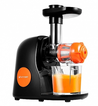 O espremedor de parafusos Kitfort KT-1111 é um dos mais baratos do ranking. O modelo é perfeito para usuários que não planejam usar o aparelho diariamente e não planejam pagar caro por isso. Ao mesmo tempo, o modelo é bastante adequado para as necessidades domésticas. O espremedor é horizontal, o que acarreta um dos inconvenientes observados pelos usuários, os produtos devem primeiro ser triturados. Ao mesmo tempo, o sem-fim lida com quase todos os vegetais e frutas. Muitas pessoas não gostam do alto teor de polpa no suco. Mas isso é típico para girar de maneira semelhante.As recepcionistas observam que o espremedor é silencioso, fácil de limpar, mas espreme o suco por um longo tempo, mesmo que o número de rotações deste modelo seja máximo na classificação. Além disso, as desvantagens incluem grandes dimensões, o dispositivo ocupa muito espaço.