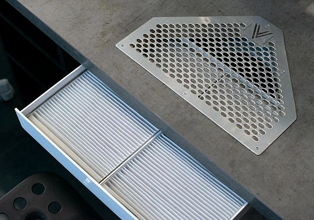 EMIL X2B é um aspirador sólido embutido na mesa de um mestre de manicure e pedicure. O design é feito de plástico resistente a impactos, a grade é de metal, o que aumenta a resistência ao desgaste. O conjunto inclui 2 coletores de pó feitos de material de duas camadas. As avaliações elogiam o modelo pelo fato de as bolsas não tocarem nas pernas do cliente, elas ficam bem localizadas logo abaixo da mesa. O capuz fornece uma superfície de trabalho limpa durante o procedimento. Fixa-se de forma segura graças às pernas de silicone e a um elástico para coletores de pó. O ruído não é muito perceptível, mas muitas vezes é necessária a substituição das bolsas - e essa é a principal desvantagem do aparelho.