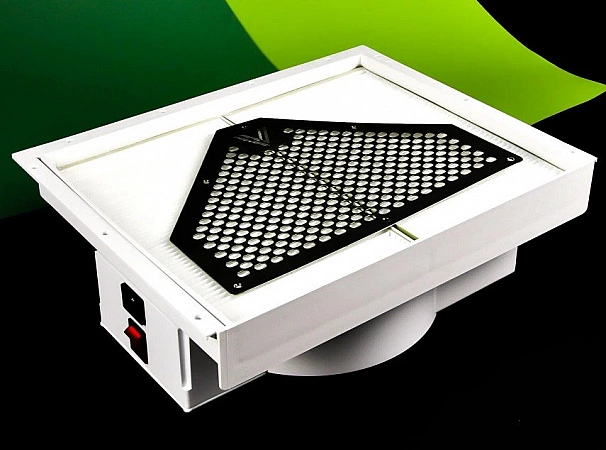 Max Storm 6 é considerado a melhor solução para mestres iniciantes em manicure e pedicure. Este é um capuz relativamente barato embutido na mesa.O aspirador está equipado com uma ventoinha potente com bom desempenho. Aspira pó, serradura e partículas de couro sem problemas. O kit inclui 2 coletores de pó volumétricos. As bolsas multicamadas seguem a forma do estojo e se encaixam perfeitamente, prendendo assim mais poeira. O sistema de instalação proprietário simplifica o sistema de substituição do filtro. As avaliações elogiam o modelo por sua operação silenciosa e estável. Os compradores reclamam do cabo curto e da potência fraca do capô - às vezes a poeira voa e não é sugada.