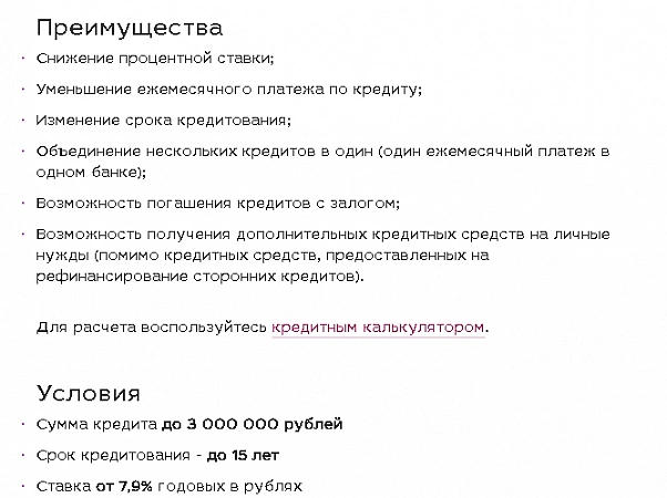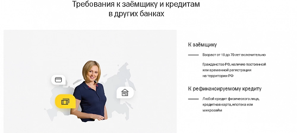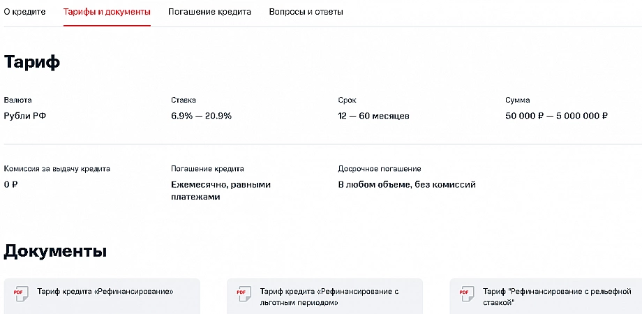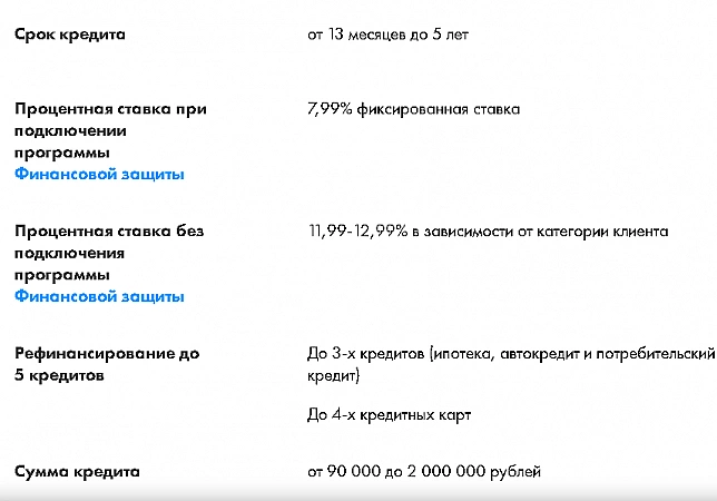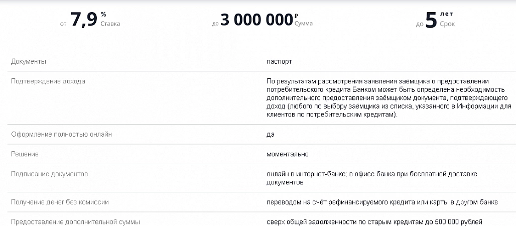 Avant de demander un refinancement dans cette banque, vous devez étudier attentivement les conditions. Par exemple, pour les emprunteurs qui utilisent déjà les services d'une institution financière, le taux sera attractif - à partir de 5,9%. Pour ceux qui s'inscrivent pour la première fois et prennent un montant important, le trop-perçu la première année sera de 6,9% fixe, puis de 7,9%, mais en tenant compte de l'assurance liée.Les clients qui refusent des services supplémentaires peuvent s'attendre à un taux de 12,9 % à 21,9 % s'ils prennent moins de 300 000 roubles, et de 11,9 % à 17,5 % lorsqu'ils prennent une grosse somme. Mais il y a aussi des avantages - la banque fournit une carte de débit gratuite avec remise en argent, et tous les revenus sont pris en compte lors de l'examen, ce qui augmente la probabilité d'approbation.