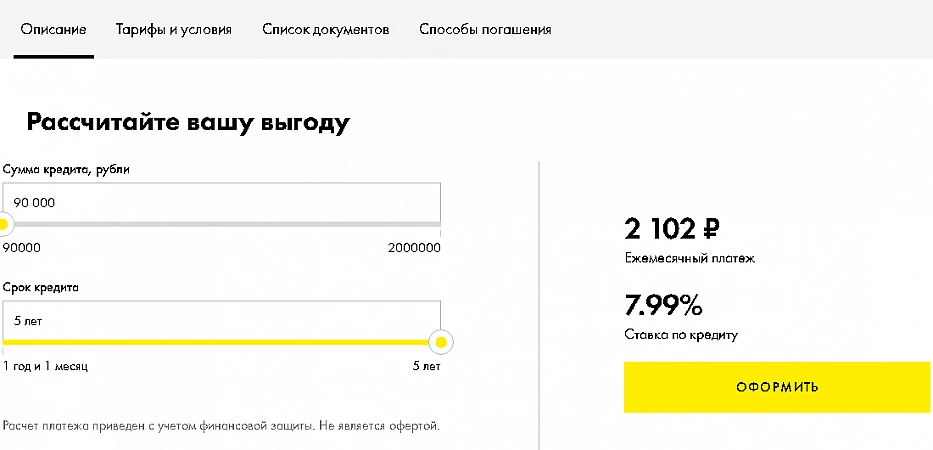 Home Credit Bank propose un programme de refinancement à un taux de 7,9%. Ce n'est pas le pourcentage le plus favorable du marché, mais d'autres conditions rendent les prêts abordables pour de nombreuses personnes.Le taux minimum dépend de nombreux paramètres, donc idéalement, vous devriez fournir un ensemble complet de documents pour obtenir un faible pourcentage. Vous pouvez obtenir de 10 000 à 3 millions de roubles, ce qui est pratique pour rembourser de petites sommes, car de nombreuses banques sont prêtes à émettre au moins 50 000 roubles. Les paiements peuvent être effectués sur une période de cinq ans. Il est pratique que vous puissiez obtenir un prêt uniquement par passeport, sans recourir à la collecte d'autres documents et certificats. Bien que cela conduira finalement à une moindre chance d'approbation. De plus, les « anciens » clients de Home Credit Bank peuvent postuler en ligne et ne pas sortir du tout de chez eux : tout se passera à distance. Mais les nouveaux clients devront se rendre au bureau et tout faire sur place.